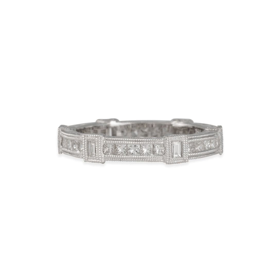 This unique diamond eternity band features square cut diamonds in a channel setting with six bezeled baguette cut diamonds. The band is finely engraved with milgrain running along the borders of the diamond channels. An excellent stacking ring or anniversary band. This style pairs will with antique jewels.