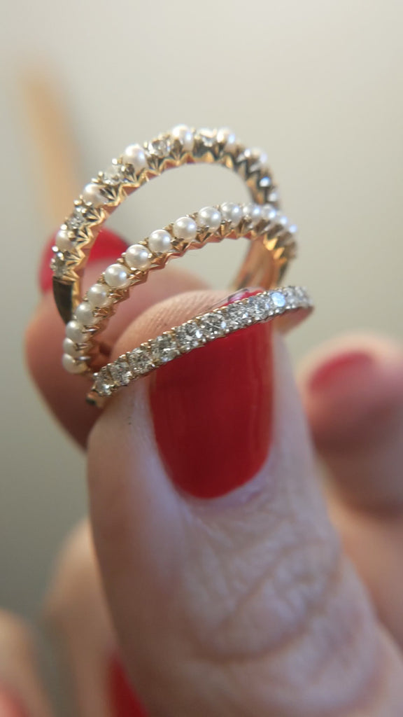 A nod to early 20th-century elegance, the French Cut Half Eternity Band glimmers with timeless craftsmanship. Each diamond is hand-set in the traditional French, or “fishtail,” style — where precise hand-cut facets beneath each stone create a sculptural geometry and brilliant play of light.
