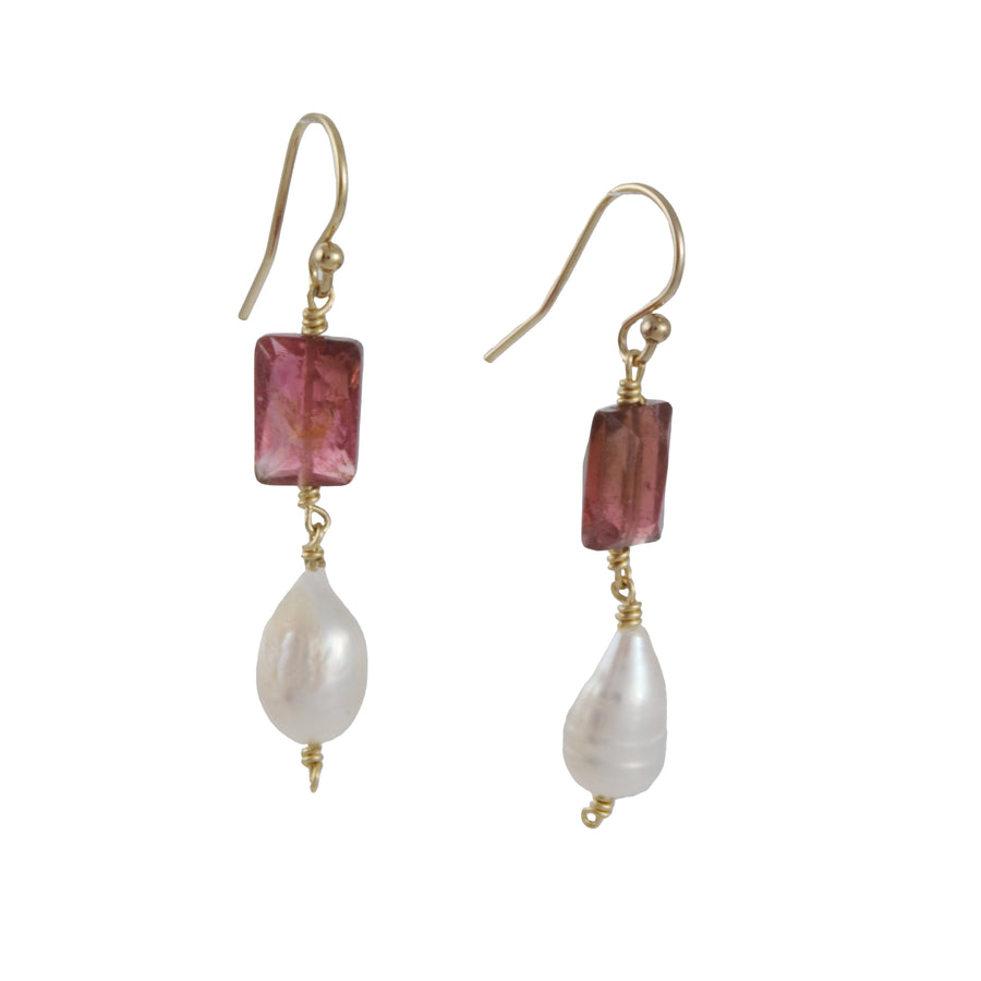 These dangle earring feature a rectangular pink tourmaline with a fresh water pearl drop. Handmade in Brooklyn by former Clay Pot gemologist Danielle Mayes.