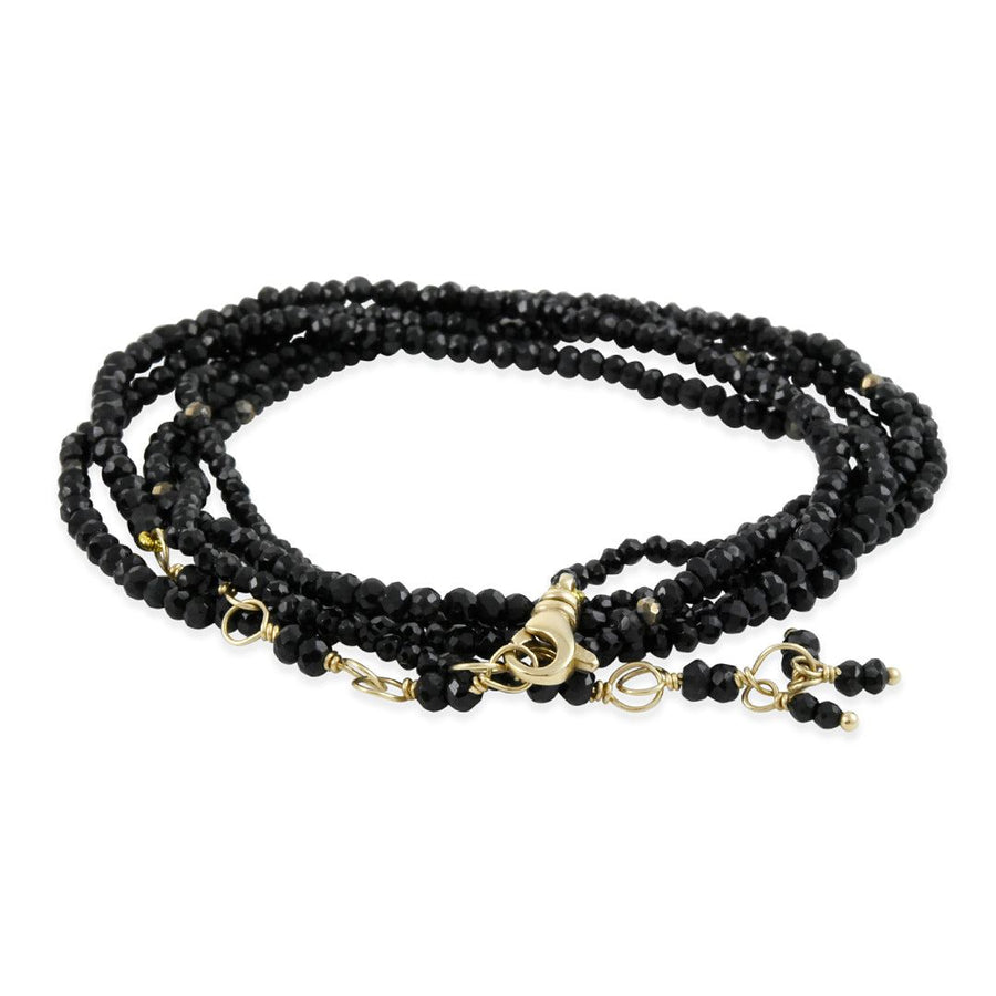 This beautiful versatile handmade piece can be worn 5 times around the wrist as a wrap bracelet or a doubled necklace. A long strand of faceted black spinel beads interspersed with glinting pyrite beads. Complete with a 14K gold swivel clasp and rosary style chain links. The links are finished off with a tassel of more spinel. The gold links serve both as an adornment, as well as rings for adjusting the size of the bracelet. Wear it as a double strand necklace or an extra-long single strand necklace.