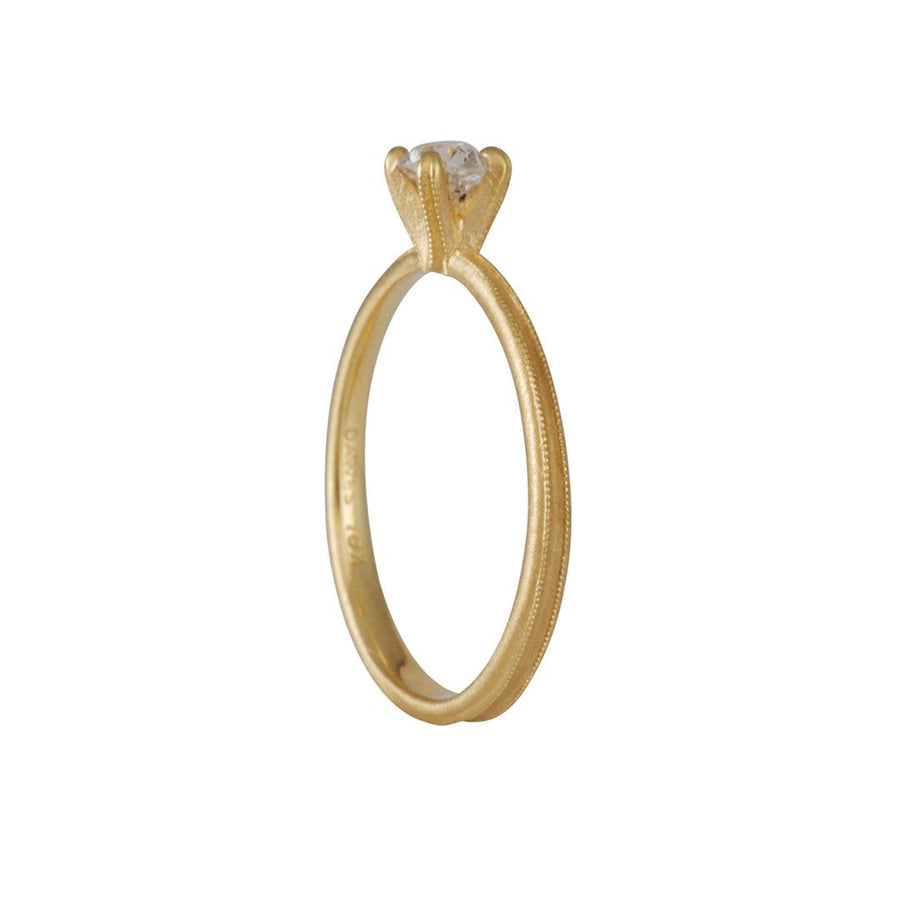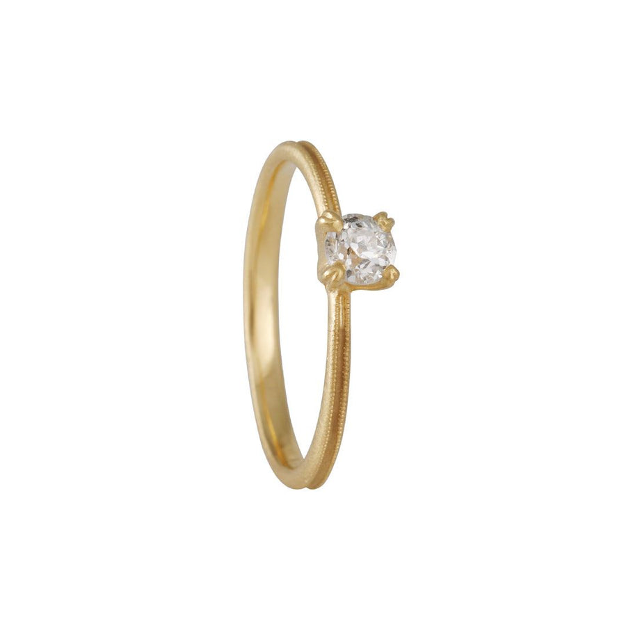 This simple, classic solitaire ring with an antique mine cut diamond and four prongs will make you feel like royalty. With its milgrain band, this piece is a unique take on a traditional ring making it the perfect piece to stack with a band or wear simply by itself.