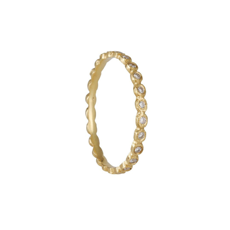 This classic stack ring features dewdrops of diamonds strung around in a band. This stunning ring holds it’s own but plays well with others for a all around shine. Handcrafted in Jennifer Dawe’s northern California studio using ethically sourced stones and metal.