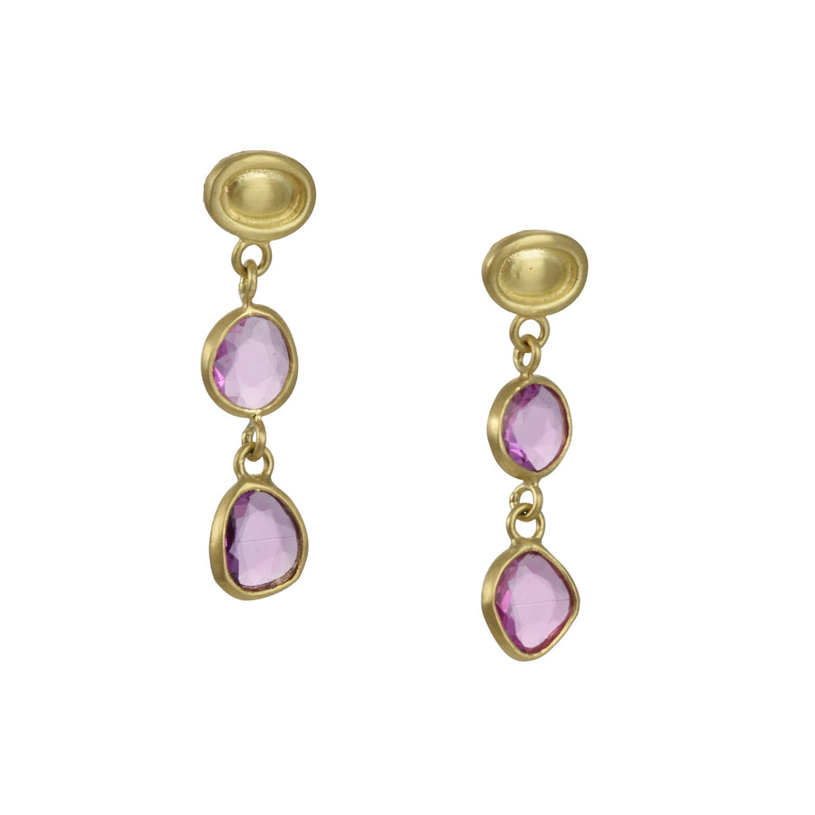 These vibrant earrings celebrate color and movement. Two organically shaped rose-cut sapphires in pink and lilac hues are bezel set in matte 18k yellow gold and suspended from soft oval posts. Elegant yet playful, they bring a joyful sparkle to any look.