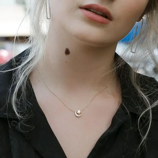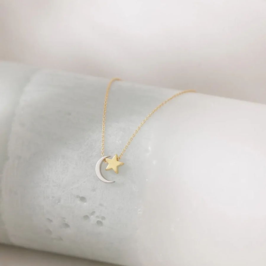 This sweet necklace features a Silver moon nestled next to a bright hold star.