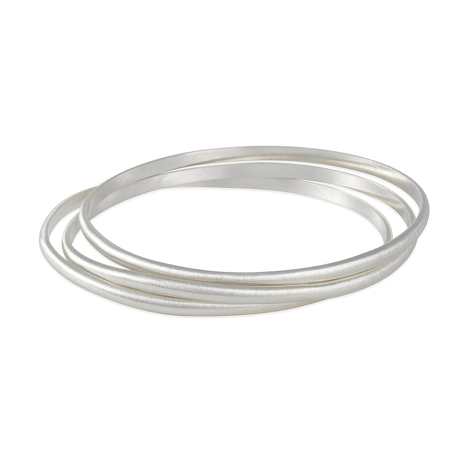 This beautiful and simple bangle bracelet has a soft organic shape with a brushed matte finish. Looks great in a set of three, as shown in alternate view. Note this price is for one bangle.