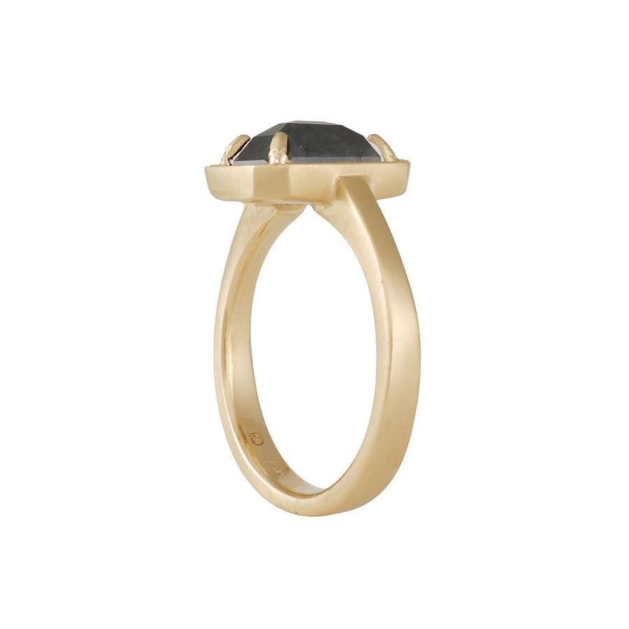 This breathtaking one of a kind ring from Rebecca Overmann features an emerald cut charcoal grey diamond in a halo setting on a weighty, sculptural band and sits slightly aloft, allowing a band to stack flush against it.