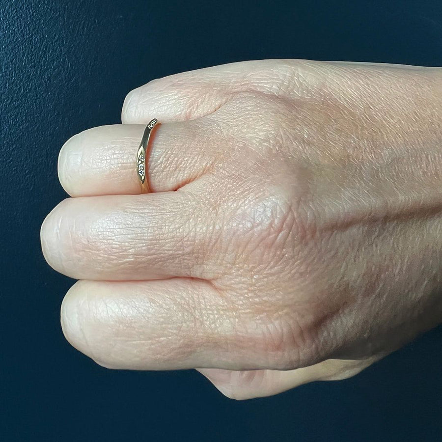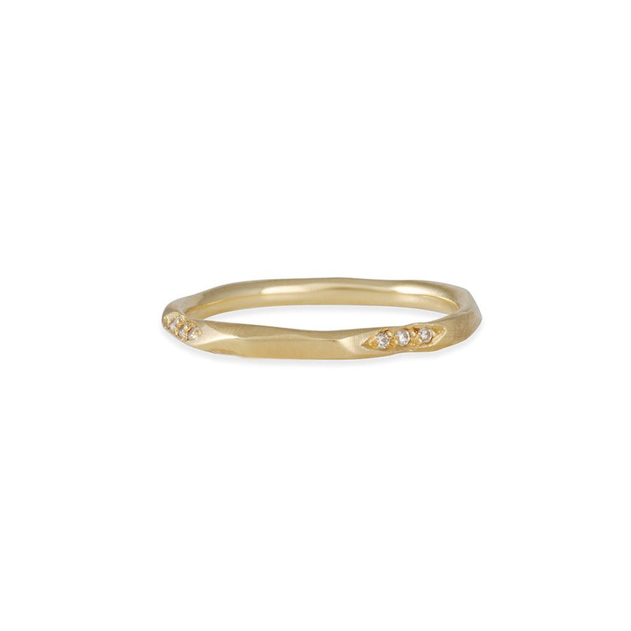 A simple and delicate design, from Rebecca Overmann, this wedding band has small sections of pave set diamonds on an organically hand forged band.