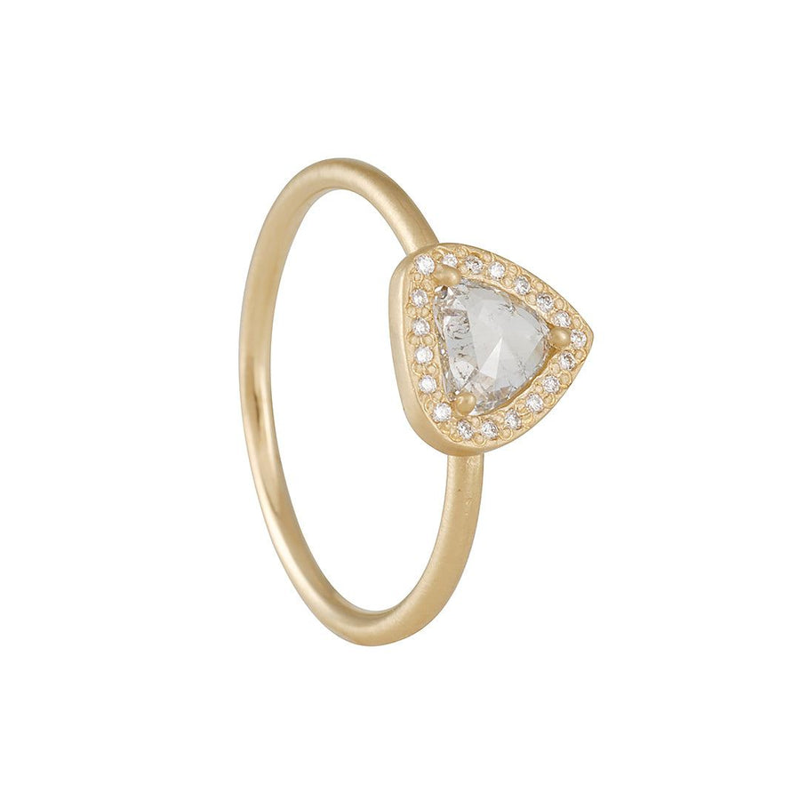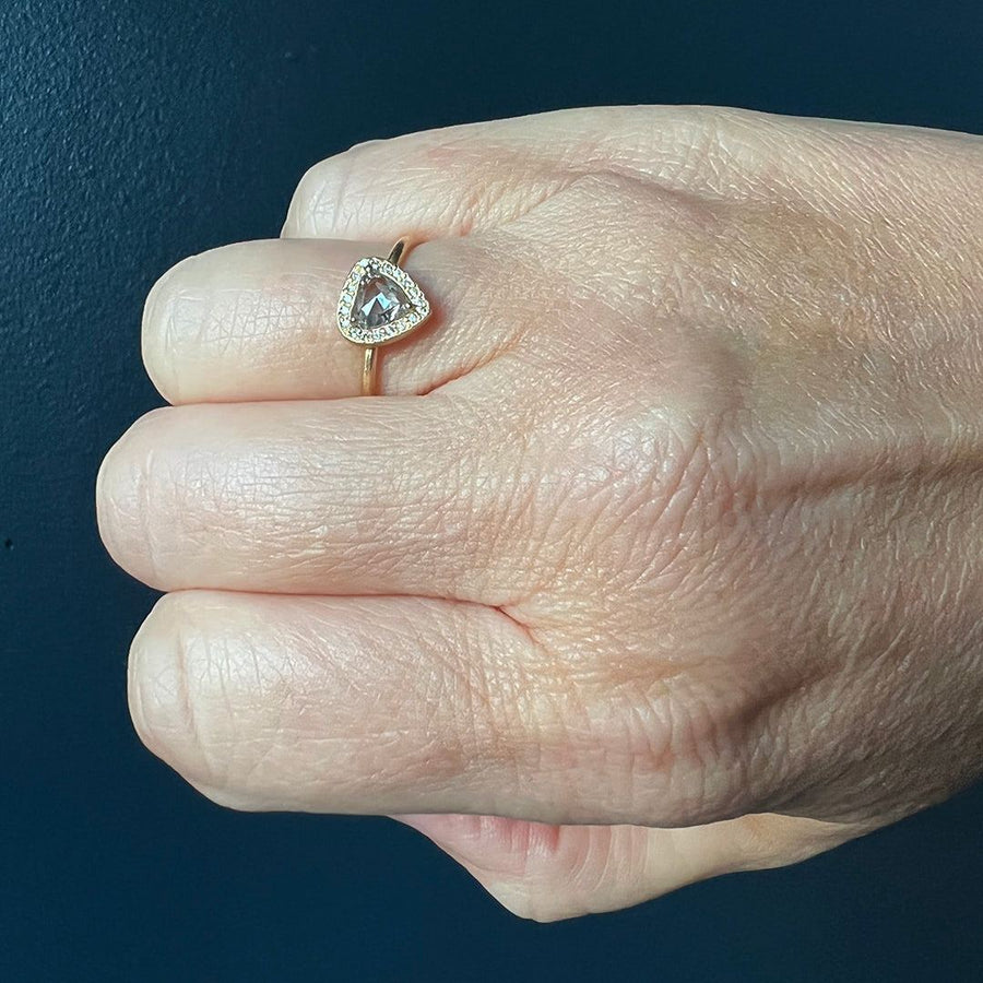 This ethereal, one of a kind ring features a trillion shaped white rose cut diamond in a sparkly diamond halo setting. great for stacking! Handmade in San Francisco, CA.