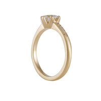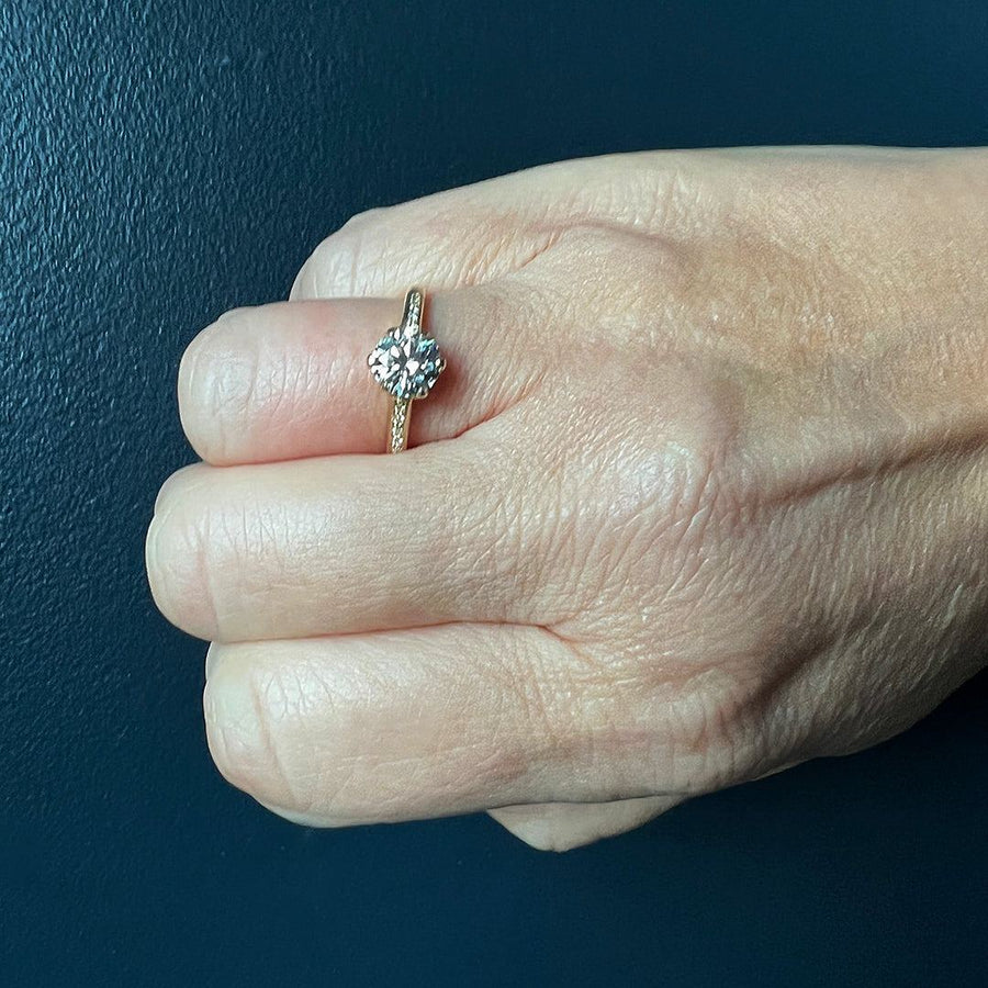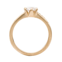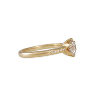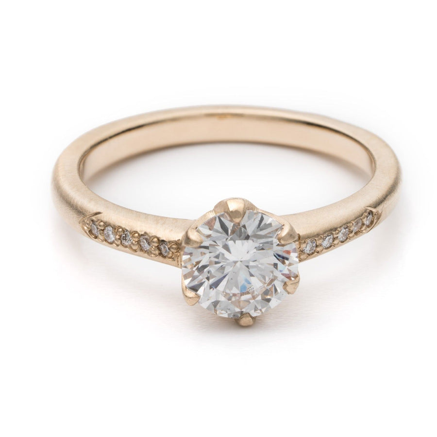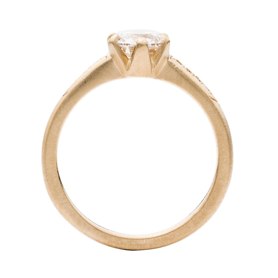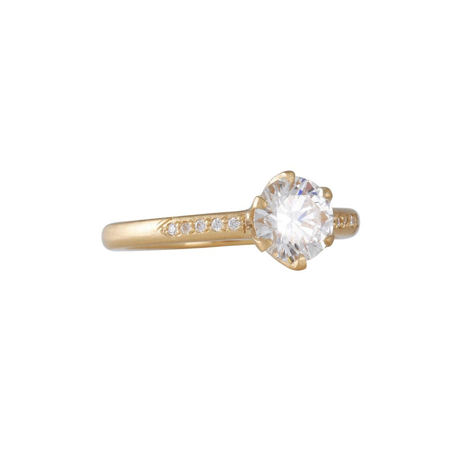 This sculptural interpretation of the classic six-prong setting from Rebecca Overmann features a 1.11ct HSI1 lab grown round brilliant diamond from Diamond Foundry. The stone, measuring 6.2mm in diameter, is set within a 2.3mm band set with pave diamonds.
