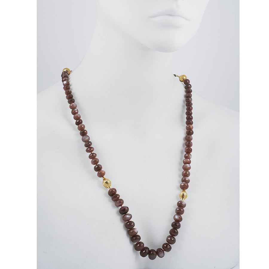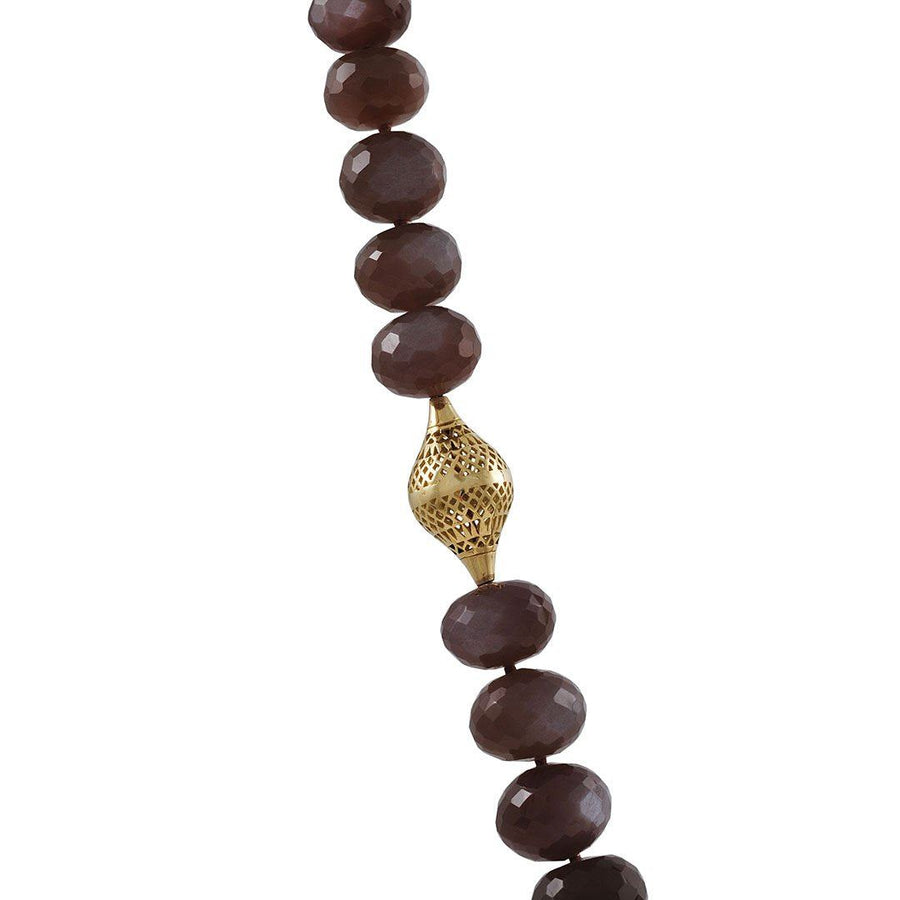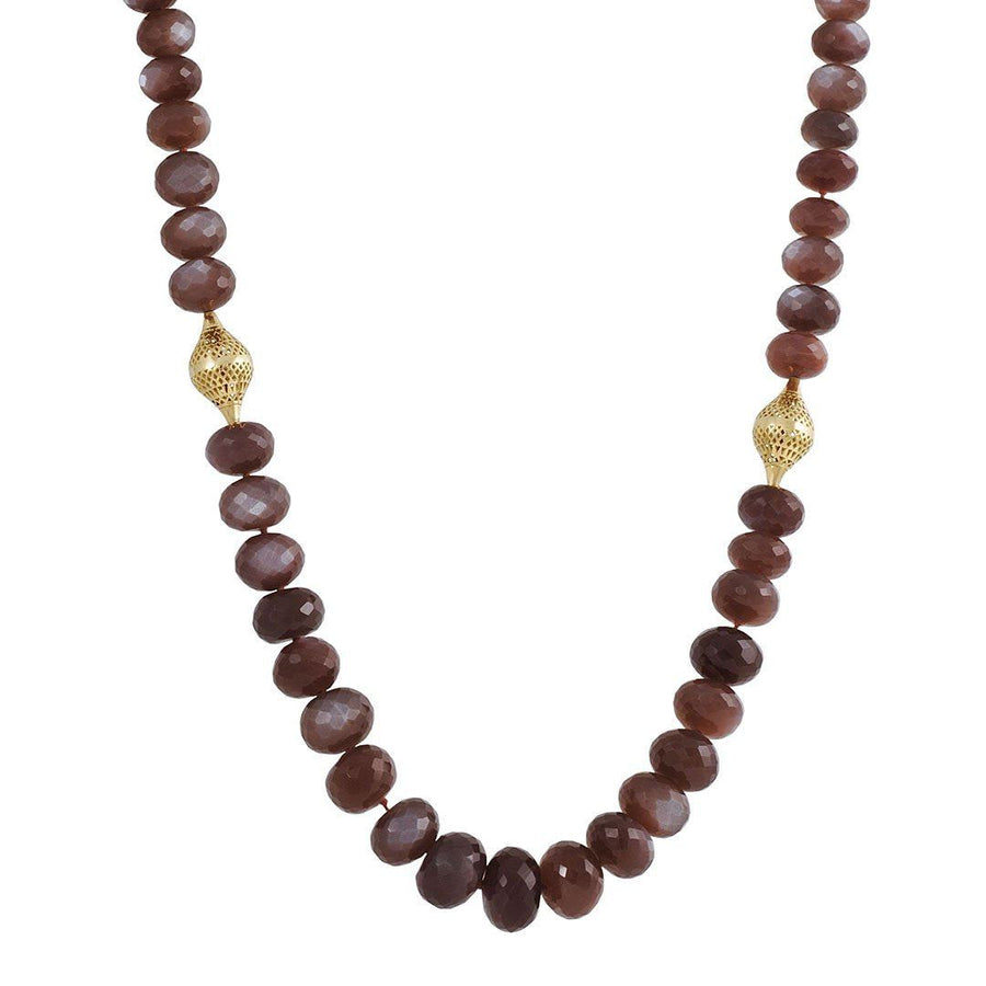 This long necklace features chocolate moonstone interspersed with four of Ray's crownwork finials. Beautifully detailed, with the pierced crownwork that is Ray's signature. The back of the necklace is strung with oxidized sterling silver beaded chain that makes the necklace comfortable. This gorgeous long necklace is perfect for wearing over a sweater or dress. Handmade in Ray's NYC studio. This piece is one of a kind.