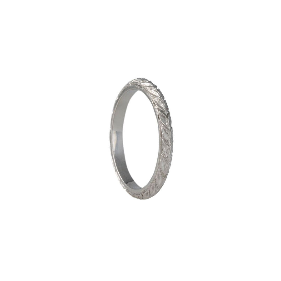 This classic band is hand engraved in the round with a laurel leaf pattern.