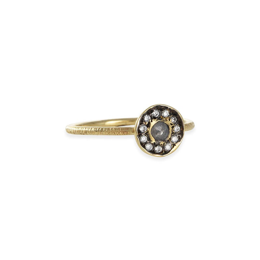 This delicate and organic one-of-a-kind ring from Ariko features a milky grey rose cut diamond, haloed by a series of diamonds set in a textured gold bezel dish.
