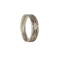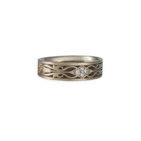 This intricately designed ring by Studio 311 features a carved pattern resembling tulips that is accented with four tiny diamonds.