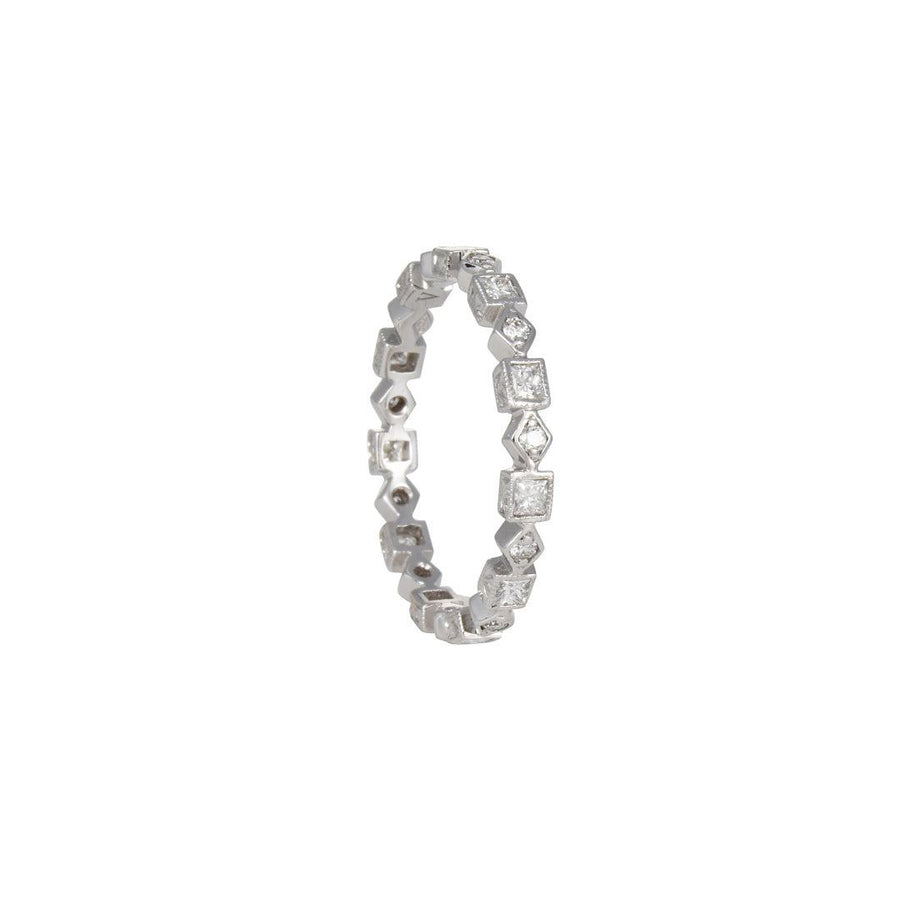 This interesting band features diamonds set in a variety of geometric shapes wrapping around for eternity.