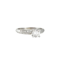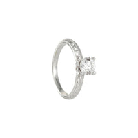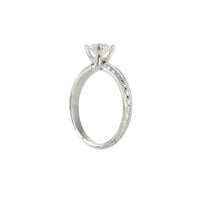 The knife-edge solitaire is a classic engagement ring style. This ring features the precise hand engraving of Varna's master engravers. Fine milgrain borders and a delicate laurel motif run along the sides of the tapering band. Handcrafted in Los Angeles, CA